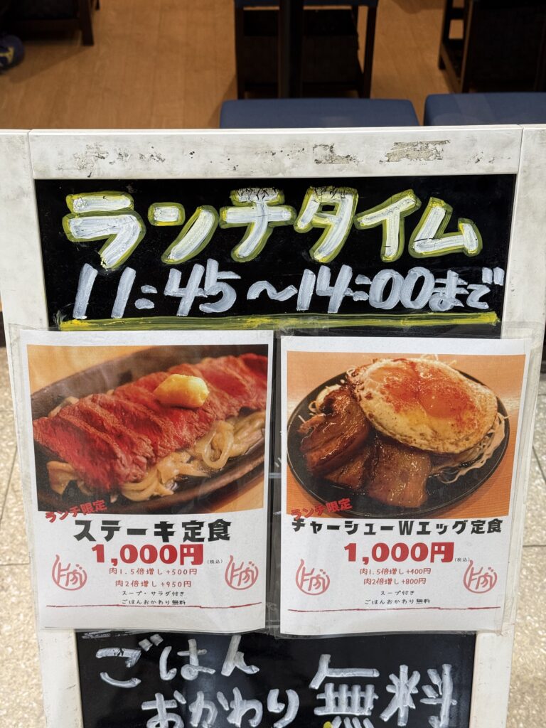 ステーキ定食とチャーシューエッグ定食の二種類になります。
