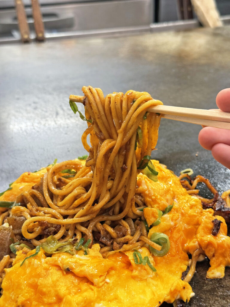牛すじ肉とこんにゃくを甘辛く炊き込んだぼっかけと香ばしいソースが麺に絡み合い、染み込んだ甘味が調和してついつい箸が止まらない。