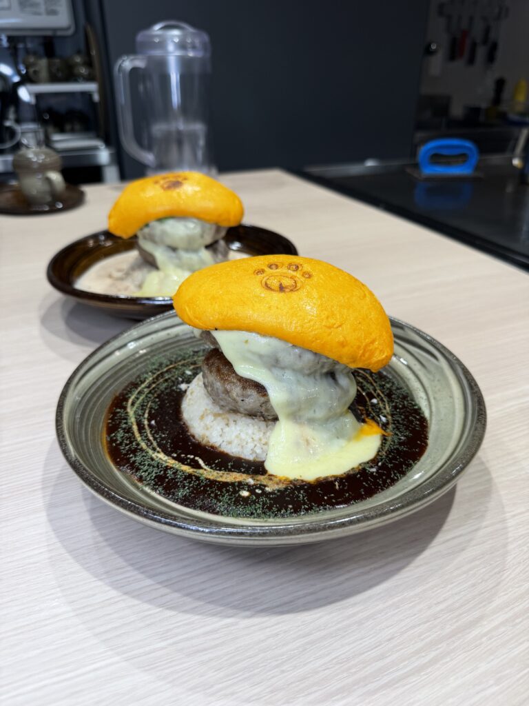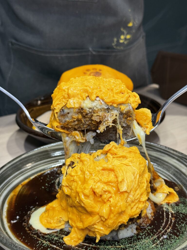 バターライスの上にデミグラスソース、生クリーム、チーズにハンバーグを2枚そしてオムレツを乗せた圧巻のビジュアル!