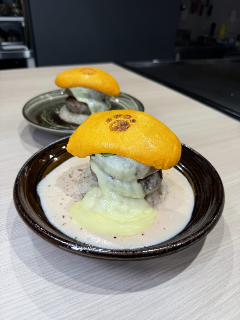 ダブルハンバーグのチーズトッピングでデミグラスソースと博多明太クリームを注文。