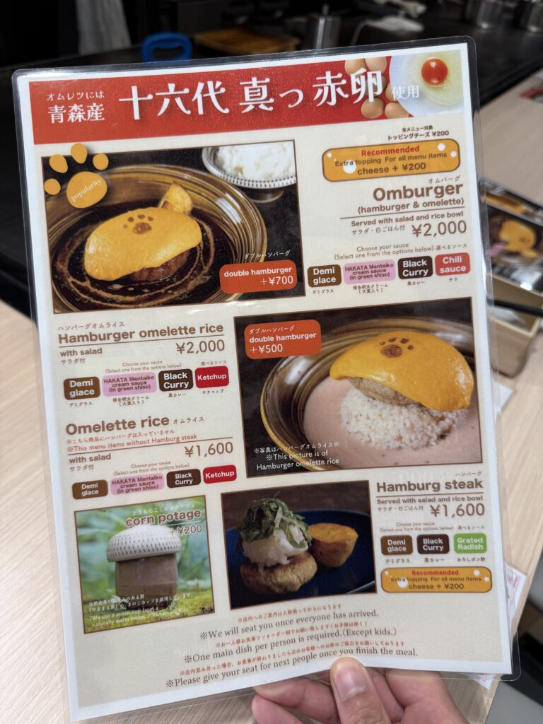 ハンバーグオムライス、オムライスのソースはデミグラス、博多明太クリーム、黒カレーそしてケッチャプの四種類から選べます。