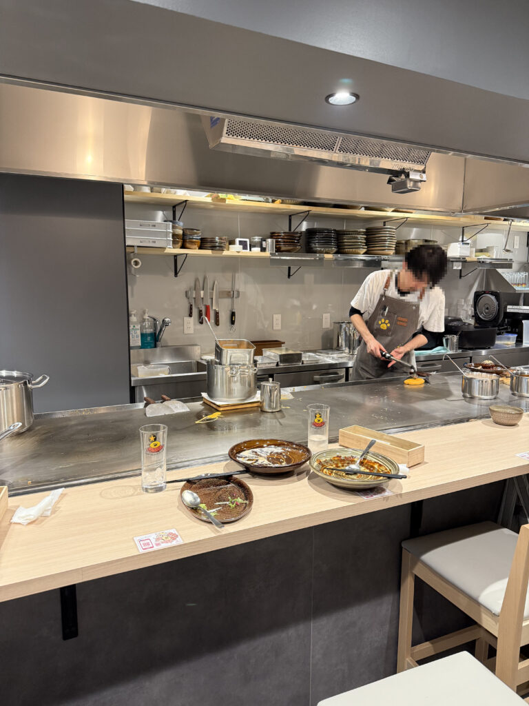 カウンター席の目の前には鉄板があり目の前で調理光景を眺める事ができライブ感があります。