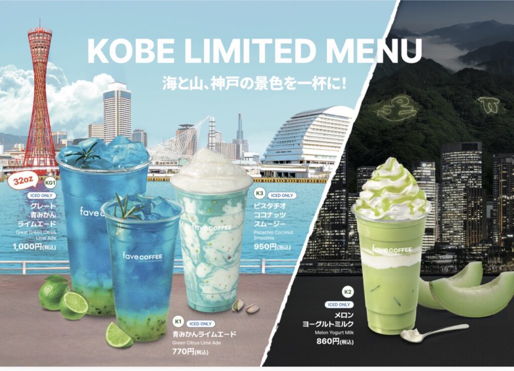海と山の二つのイメージがある神戸元町店ならではのドリンクもあって、海をイメージした青みかんライムエード、ココナッツスムージーそして山をイメージしたメロンヨーグルトミルクというラインナップ。