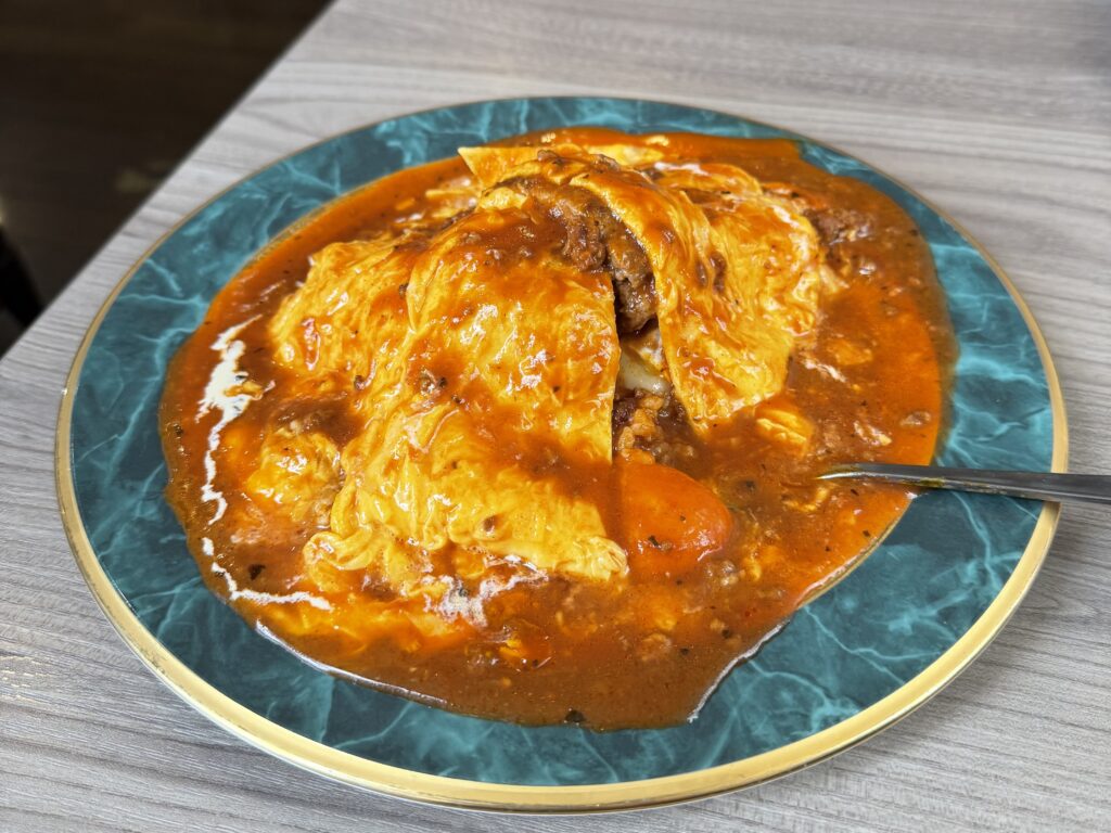 ふんわりオムレツやジューシーなビーフバーグ、カマンベールチーズにコク深いデミグラスソースがたっぷりとかかっています。