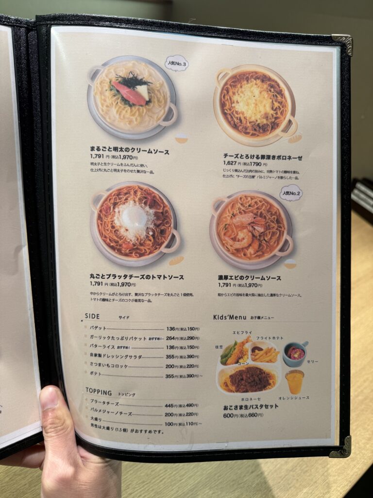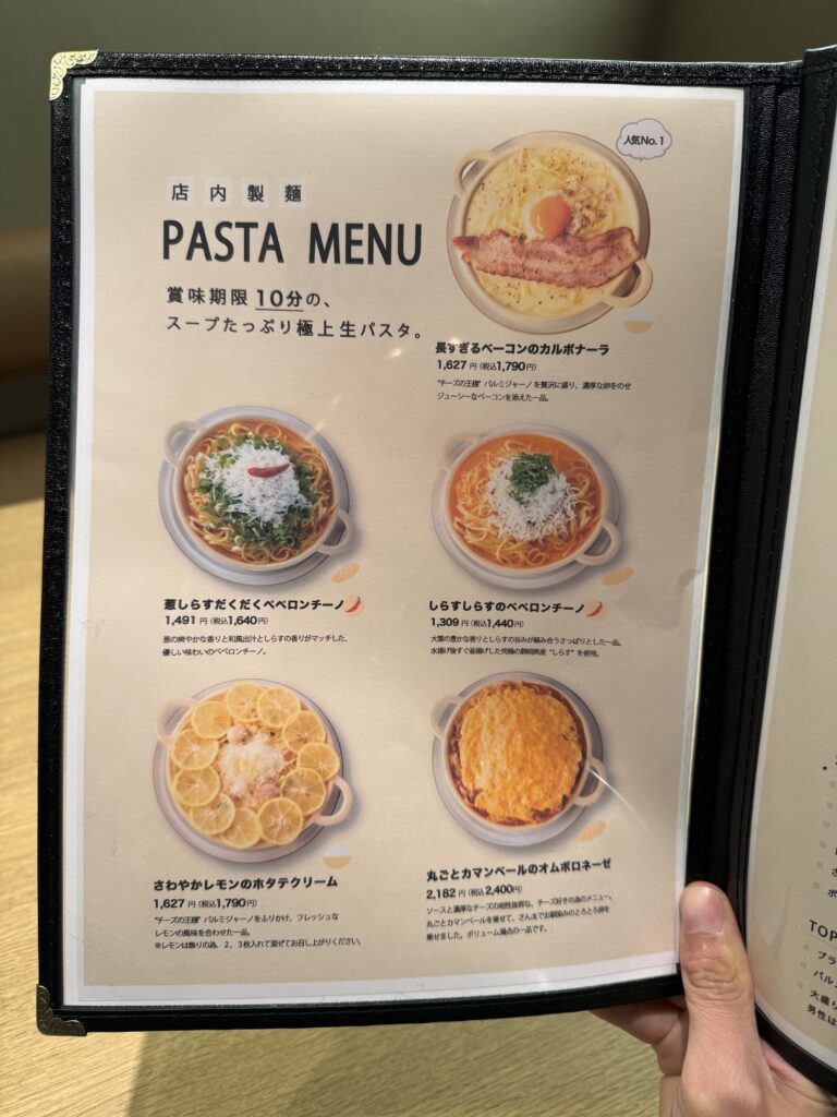 生パスタはカルボナーラ、ペペロンチーノ、明太クリームソース、ボロネーゼなど種類が豊富。