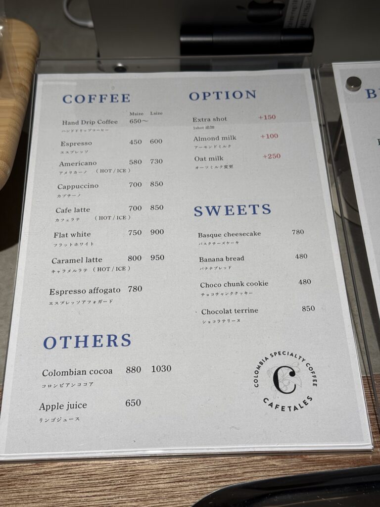 ハンドドリップコーヒー、エスプレッソ、カフェラテにフラットホワイトなどがあります。