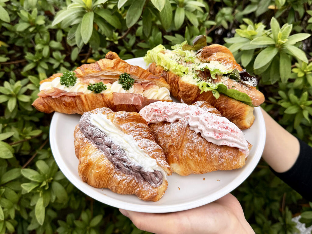 クロワッサンサンドは甘い系はいちごモンブラン、あんこバター、惣菜系はあらびきソーセージ、生ハムとクリームチーズ、ツナ&コーンと種類豊富。