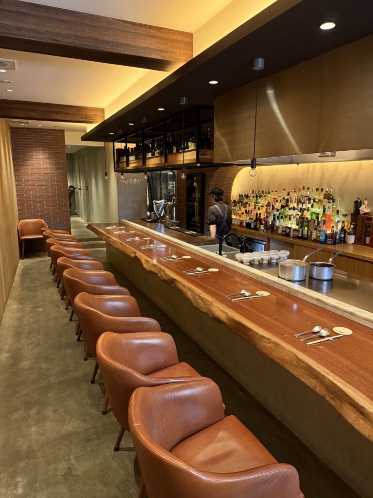 内装は一枚板でのカウンターにこだわり、落ち着いた雰囲気。