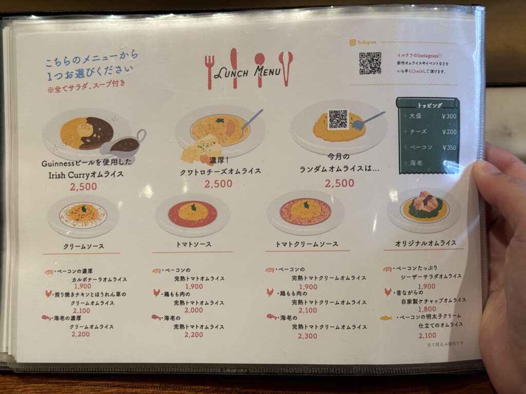 ランチタイムのオムライスメニューがこちらで、全てにサラダとスープがついています。