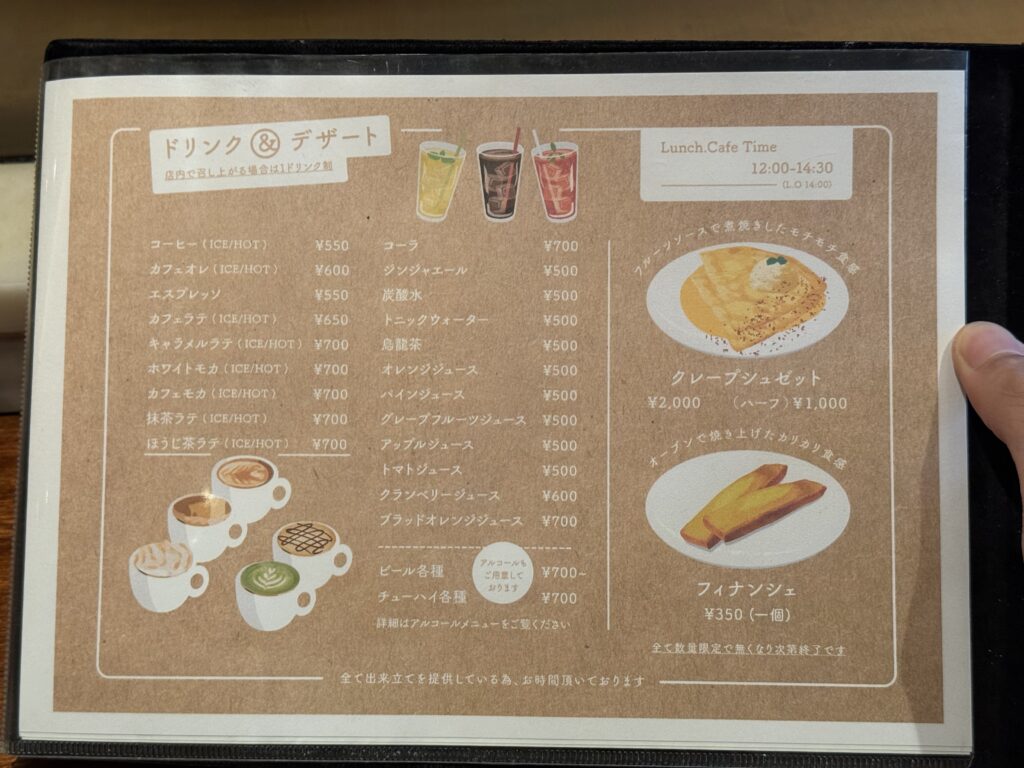 さまざまなドリンクにデザートはクレープシュゼットとフィナンシェがありました。