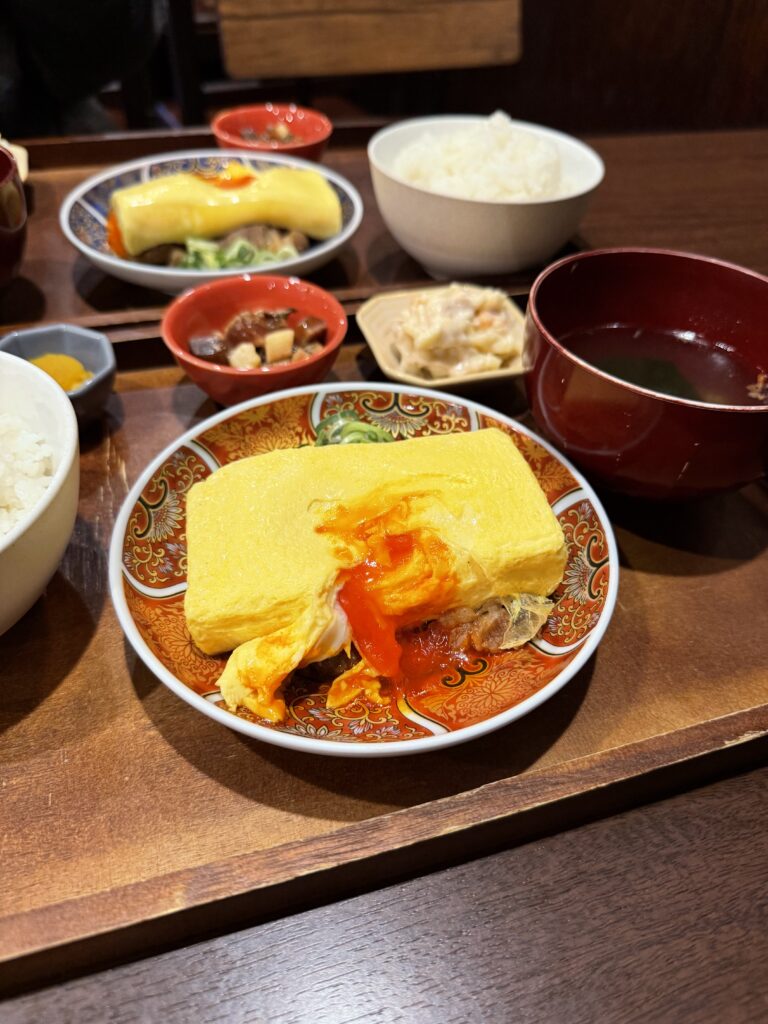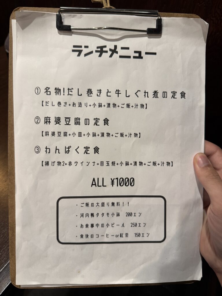 ランチタイムはだし巻きと牛しぐれ煮の定食のほかに麻婆豆腐定食、わんぱく定食の三種類。
