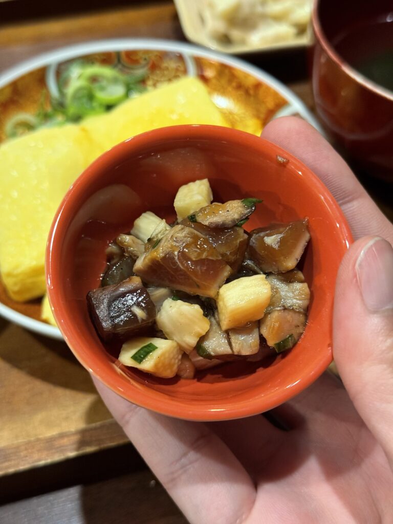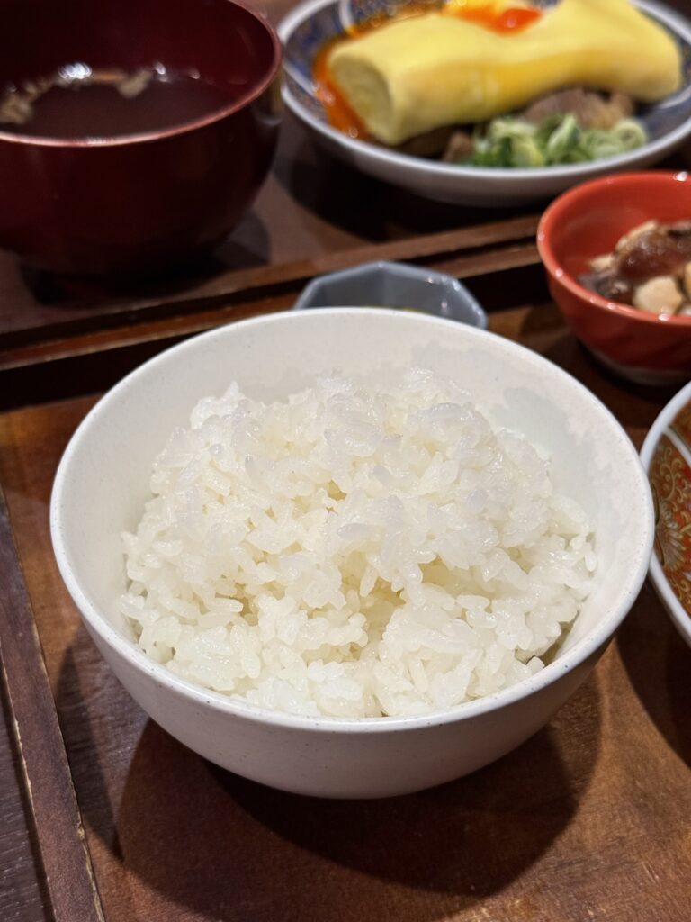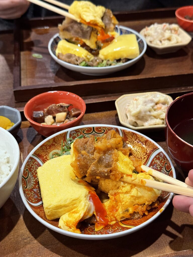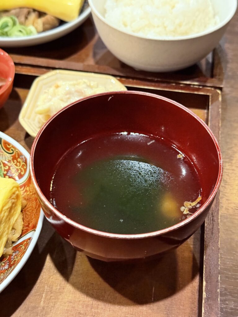 だし巻きと牛しぐれ煮に、ご飯、小鉢二種類、スープ、漬物という内容。