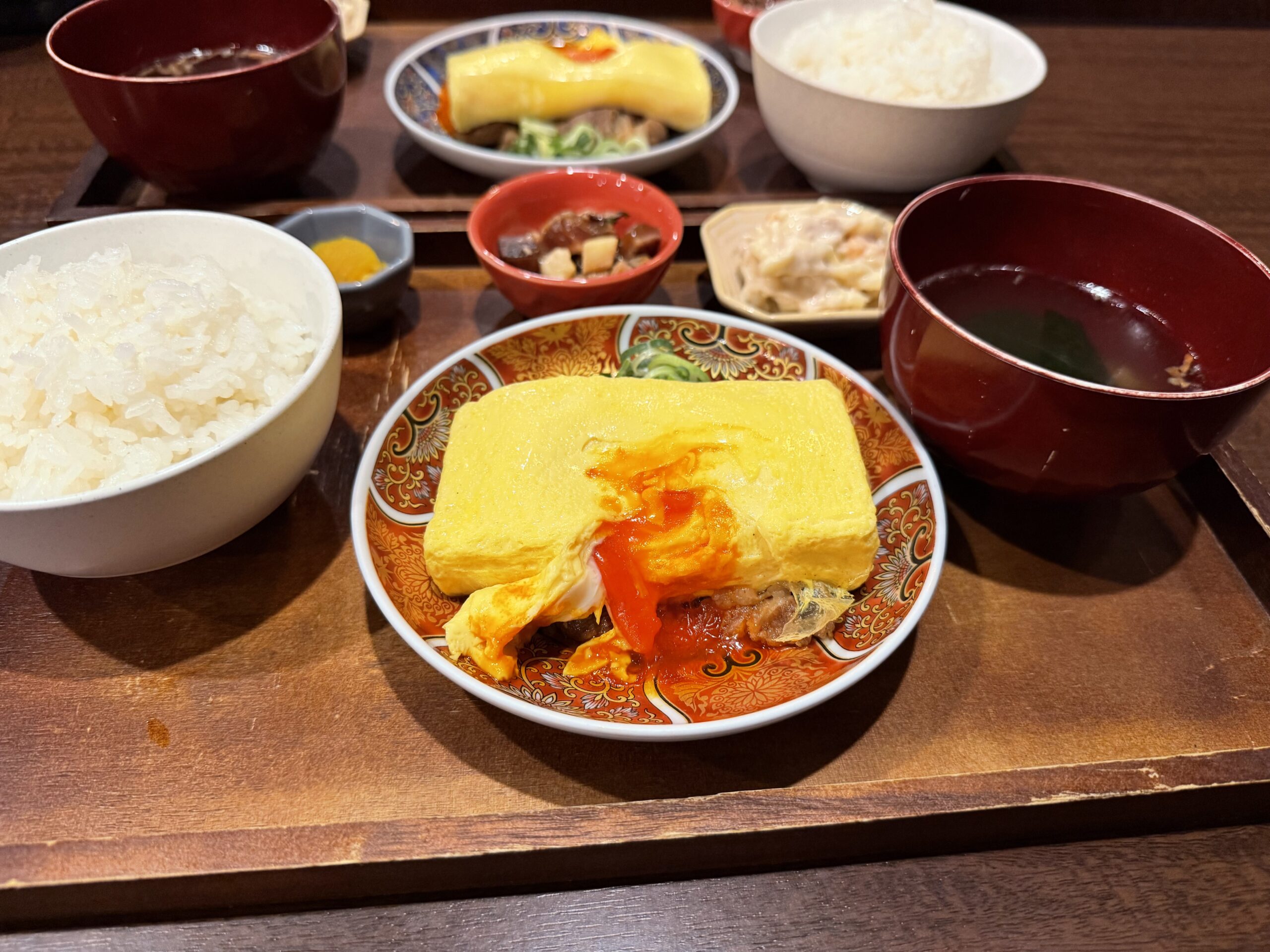 だし巻きと牛しぐれ煮に、ご飯、小鉢二種類、スープ、漬物という内容。