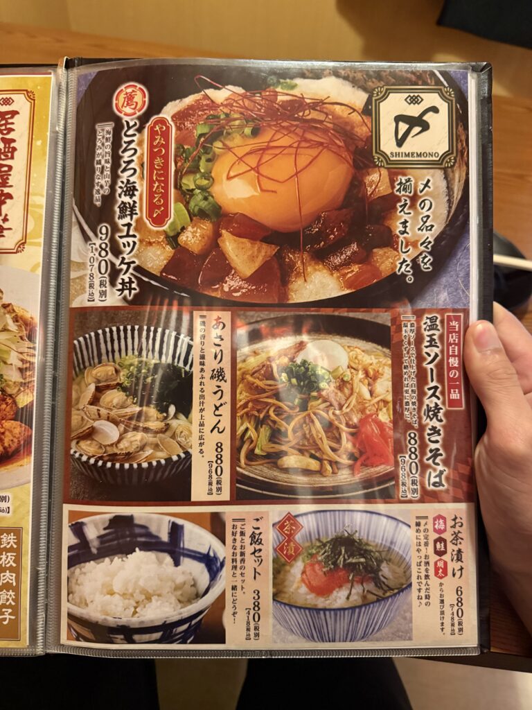 〆は海鮮ユッケ丼、ソース焼きそば、あっさり磯うどんなどがあります。