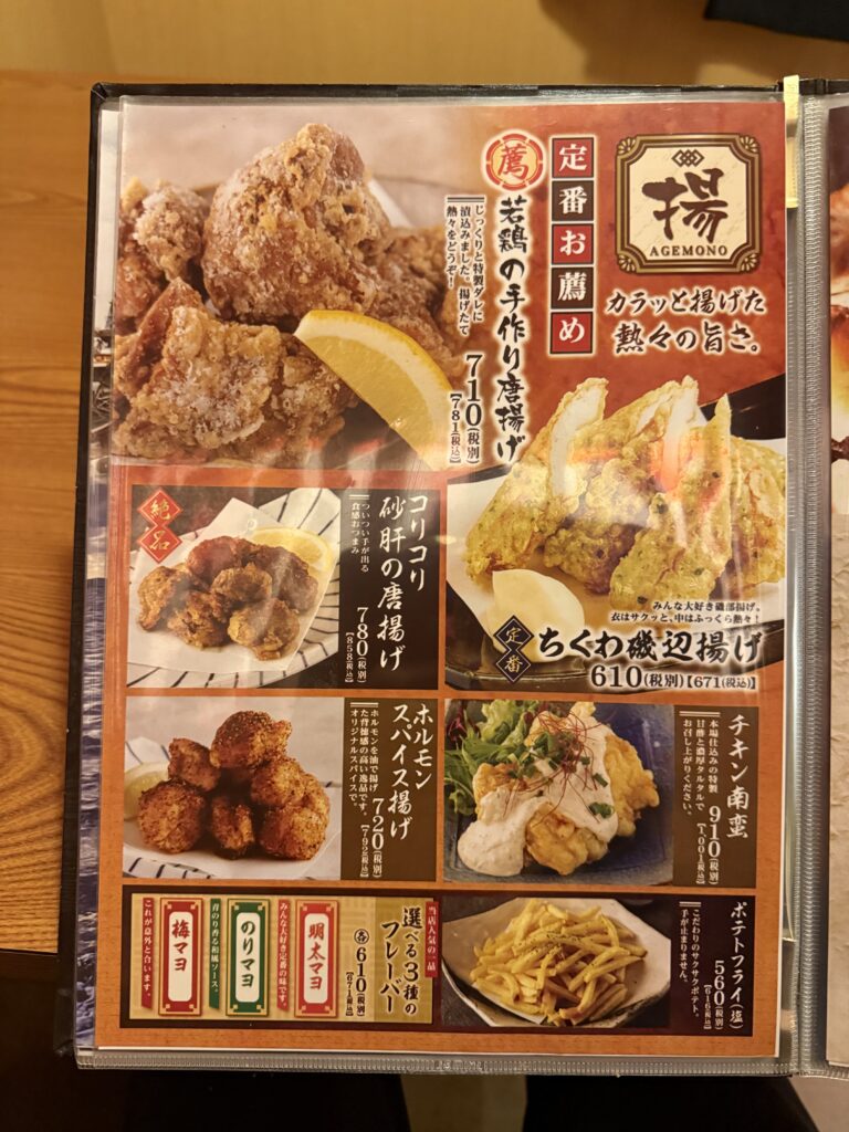 揚げ物は定番の鶏の唐揚げ、砂肝の唐揚げ、チキン南蛮、ポテトフライ。