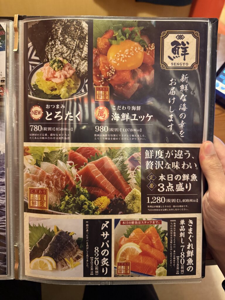 海鮮は海鮮ユッケ、とろたく、サバの炙りなど。