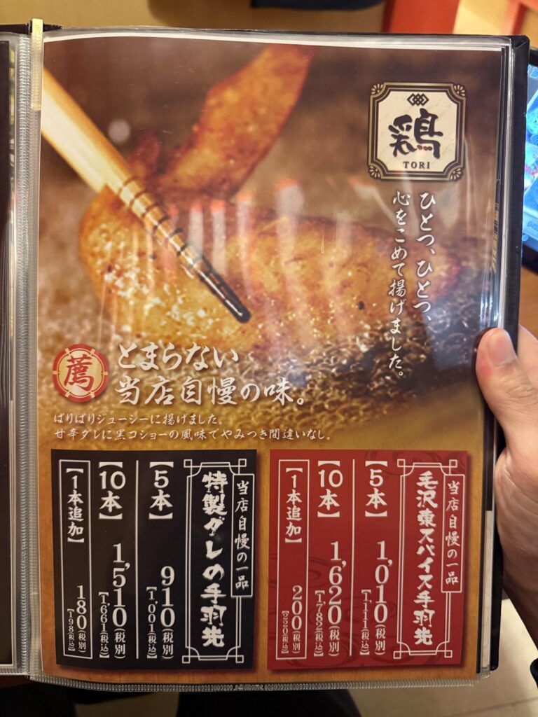 鶏料理は特製タレ、毛沢東スパイスの手羽先で5本と10本さらに1本づつ追加可能。