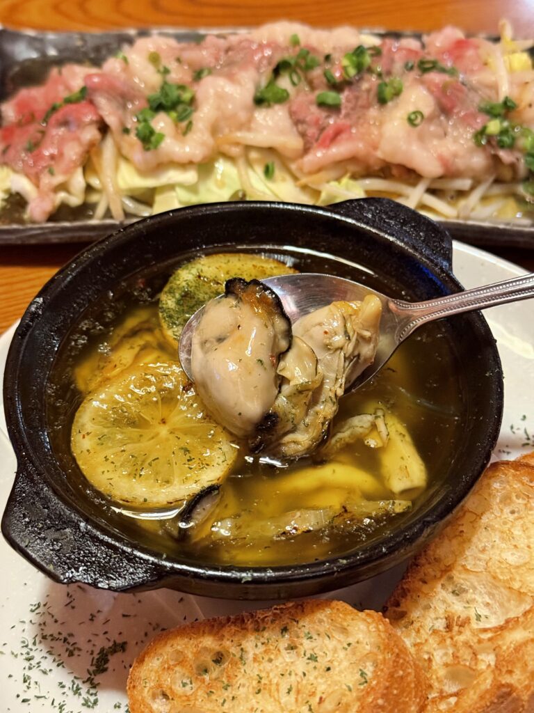 旨みの詰まった牡蠣が5粒ほど、カリカリバゲットにオイルを染み込ませ一緒に食べてみてください。