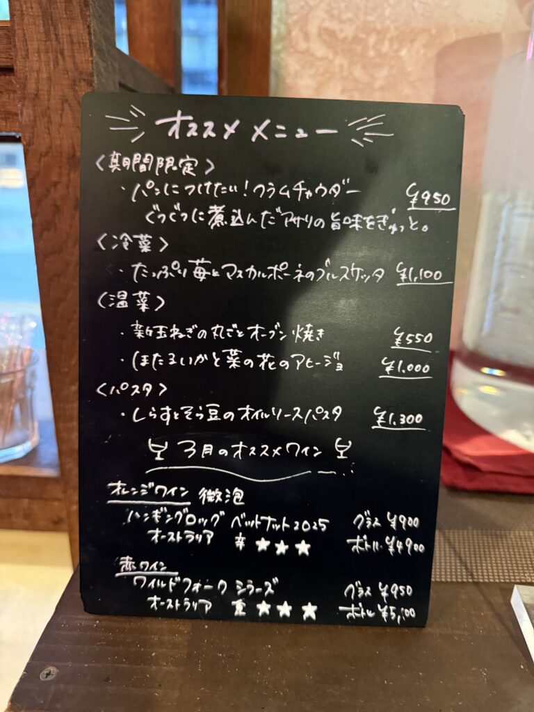 その日のおすすめメニューが店内に掲示されていてこの日はクラムチャウダーやホタルイカのアヒージョ、しらすのオイルソースパスタなどとなっていました。