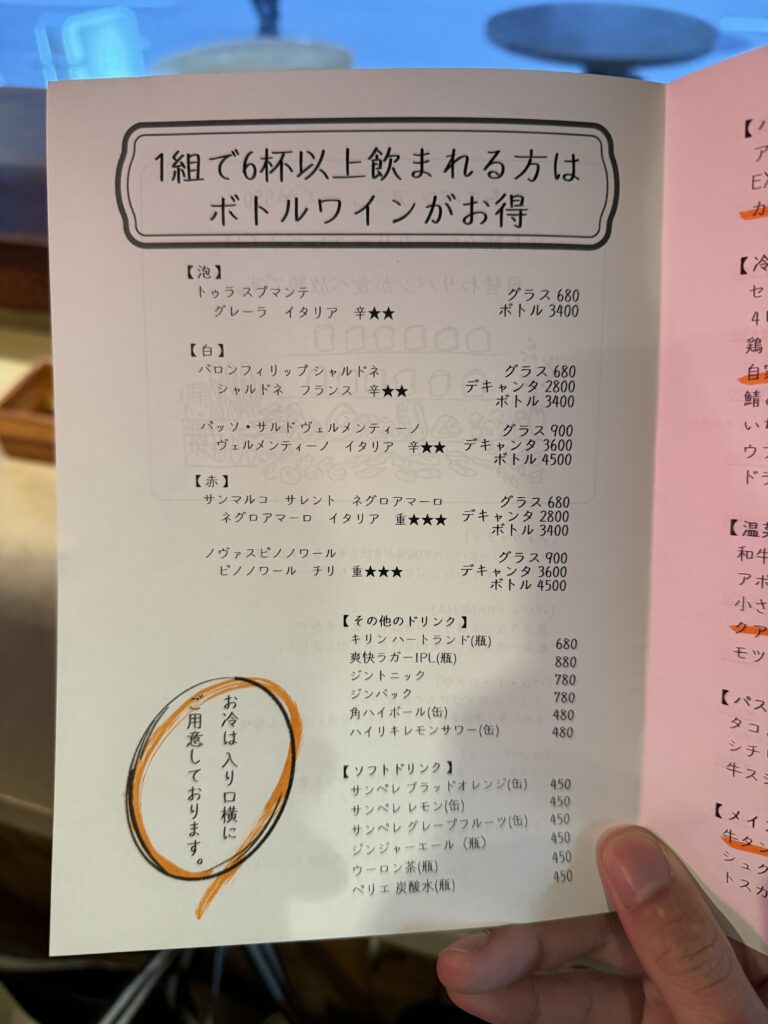 ワインがグラスの他にボトルもあり、その他にはビール、ジントニック、ハイリキレモンサワーなどのアルコール。