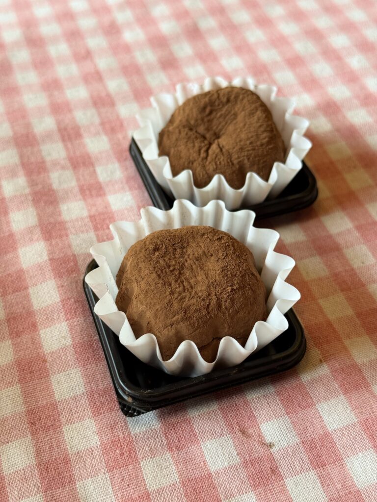 ピスタチオペーストをたっぷり染み込ませたカダイフをマシュマロもちで包み込み、ココアパウダーを纏ったスイーツで食べやすいサイズ。