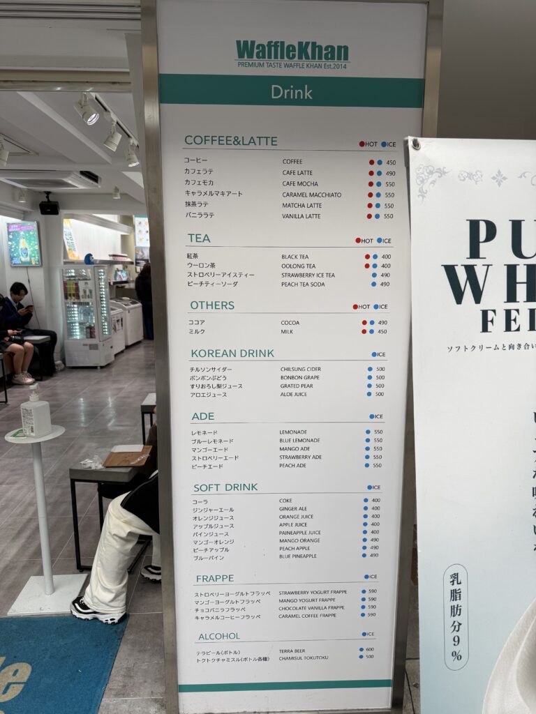 コーヒー、カフェラテ、紅茶などに加えて、マンゴーやストロベリーを使ったエイド、ソーダなどもありました。