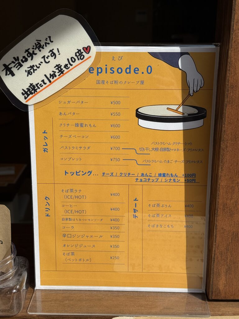 「episode.0(エピソードゼロ)」さんは2026年1月14日オープンの蕎麦屋から仕入れる国産そば粉を使った甘い系、食事系のガレットが楽しめるお店。
