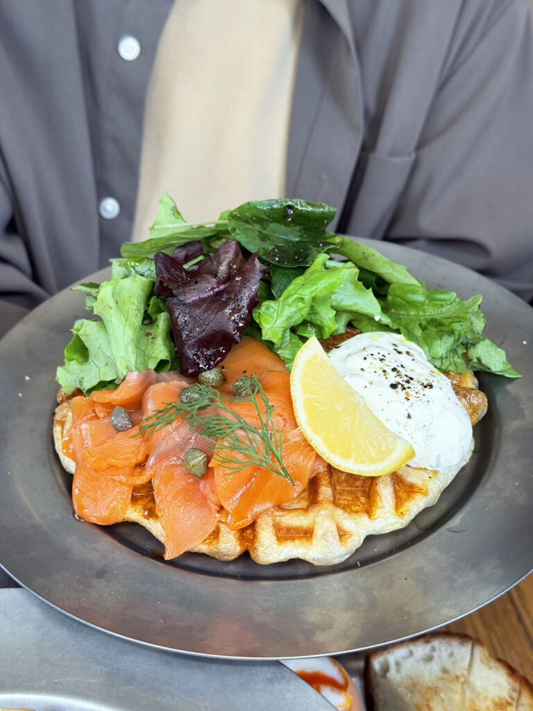 カリッとふんわりが共存するワッフルにカリカリベーコンに濃厚な蘭黄卵が合わさりしょっぱさがクセになる一品です。