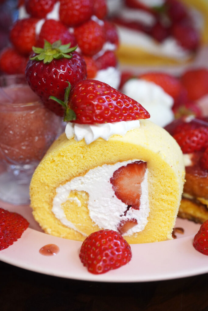 いちごロールケーキ、苺スムージー、いちごのミニパフェ、フレンチトーストそして苺大福、その周囲には苺でデコレーションした美しいプレート。