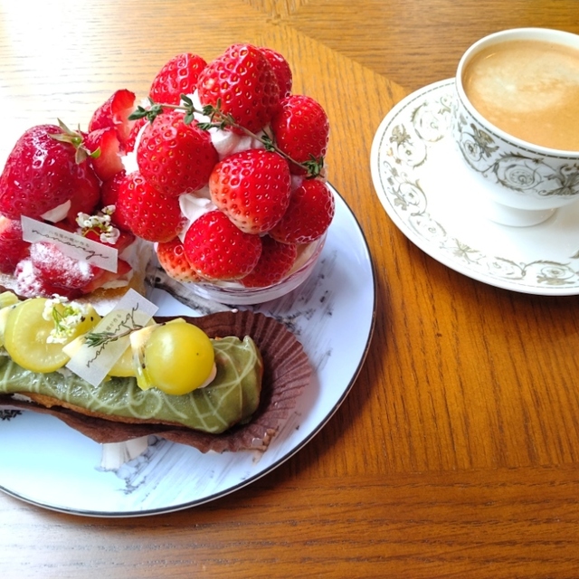 苺のミニパフェにショーケースの中から2つ選んだスイーツを一皿に乗せたプレートに苺パフェ。