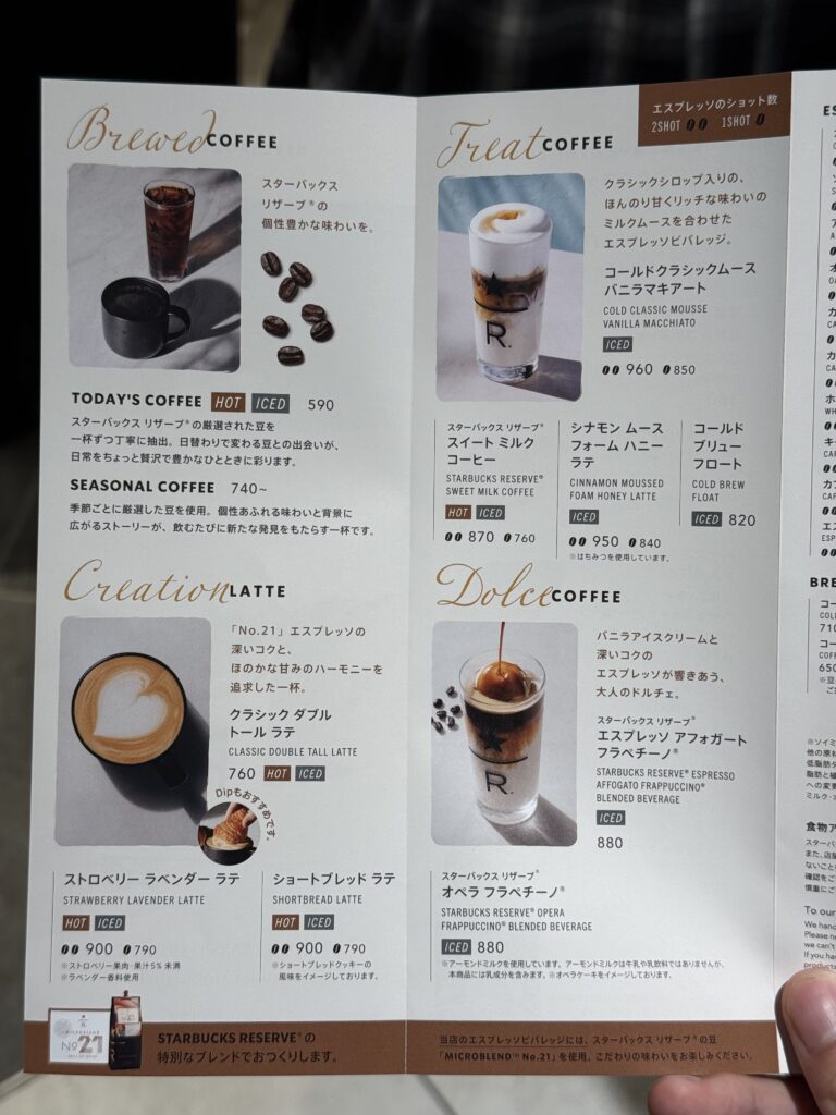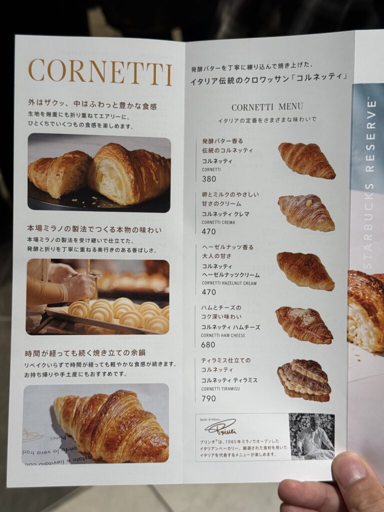 普段のスタバとはまた違ったオシャレな雰囲気の中、エスプレッソを使った多彩なビバレッジとイタリアのクロワッサン「コルネッティ」を味わう事ができます。