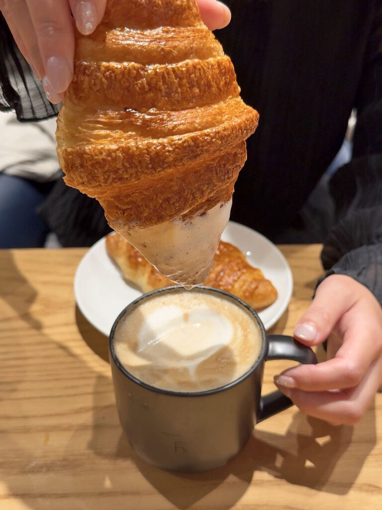 バターの風味豊かなコルネッティをたっぷりのフォームをのせたカプチーノにひたして楽しむのがイタリア・ミラノ流。