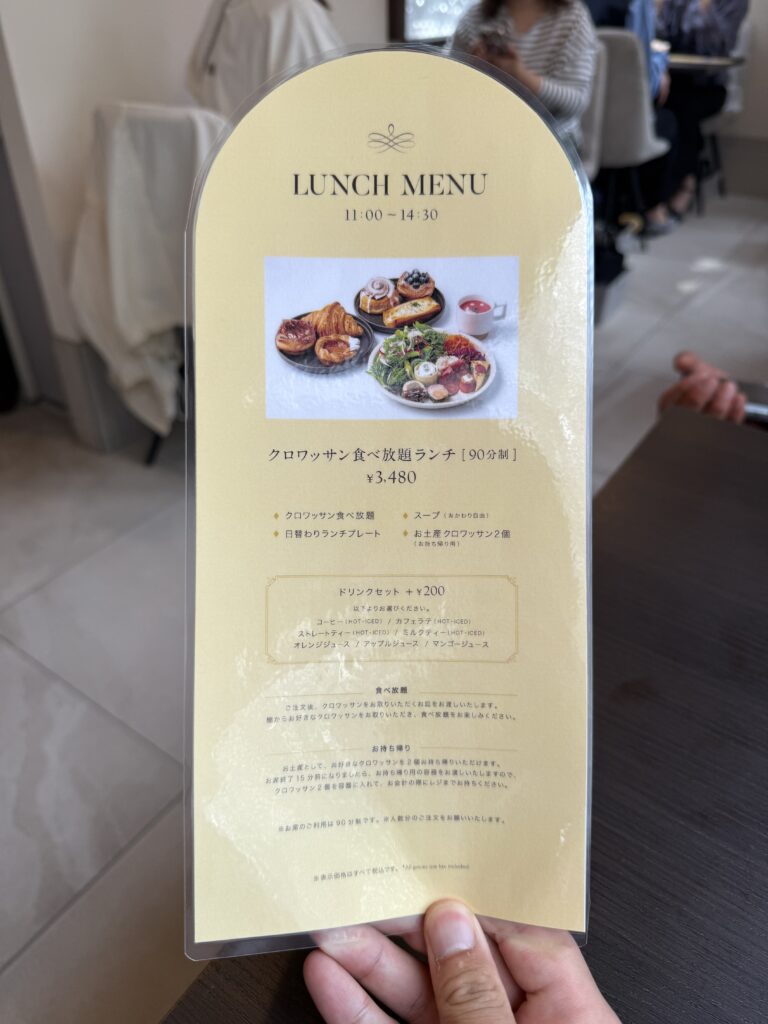 クロワッサン食べ放題ランチは90分制になっていてプラス200円でドリンクをつけることもできます。