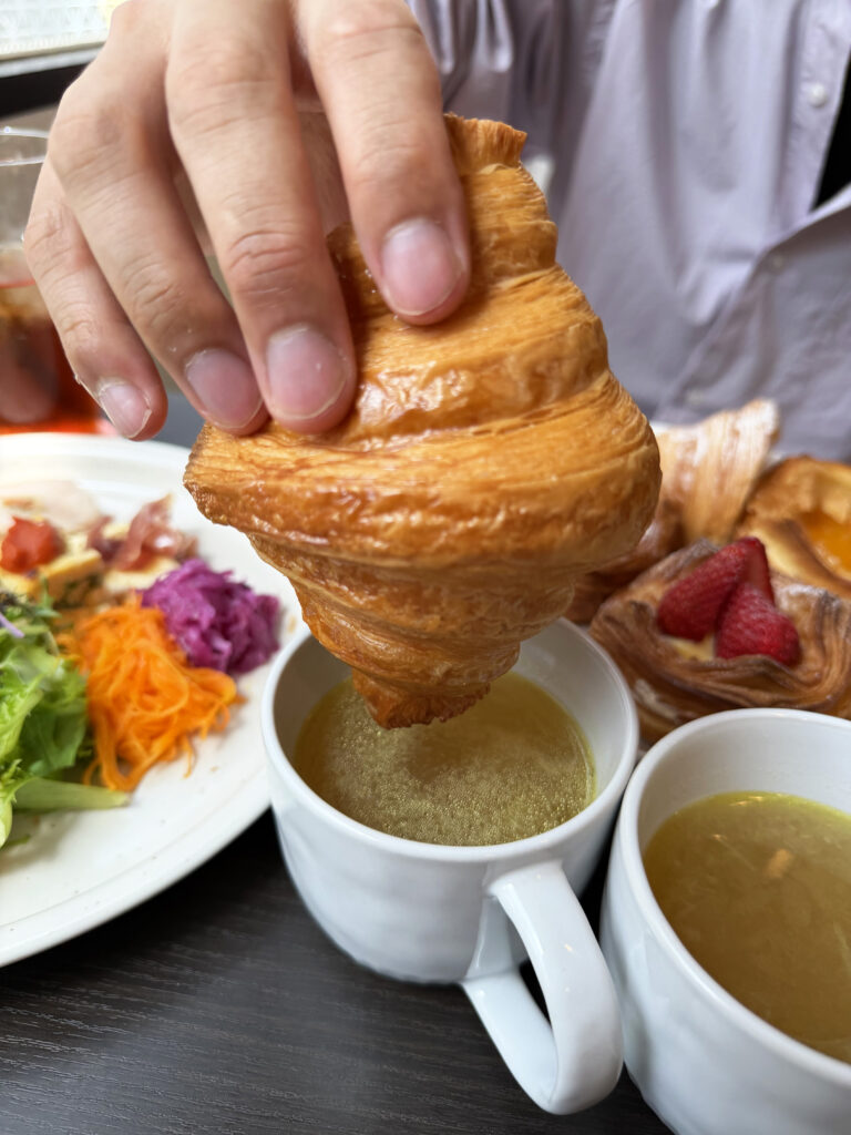 スープはそのまま飲んでも良いですが、クロワッサンをディップして食べるとまた違った味わいを楽しめすよ。