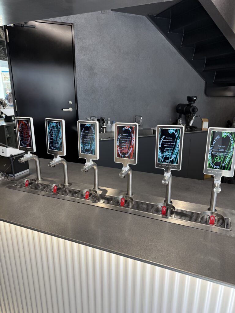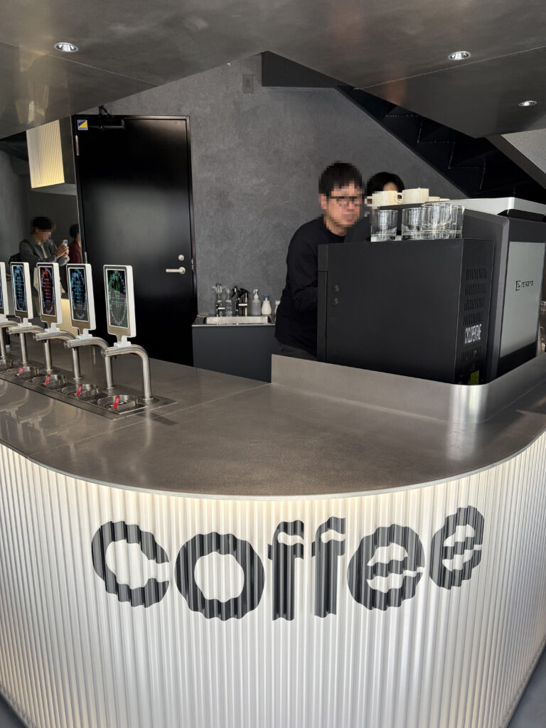 タップマシンと呼ばれる抽出機を使い、スペシャルティコーヒー(品質の高いコーヒー)を約10秒で提供するのが特徴で、店内も近未来感を演出してオシャレです。