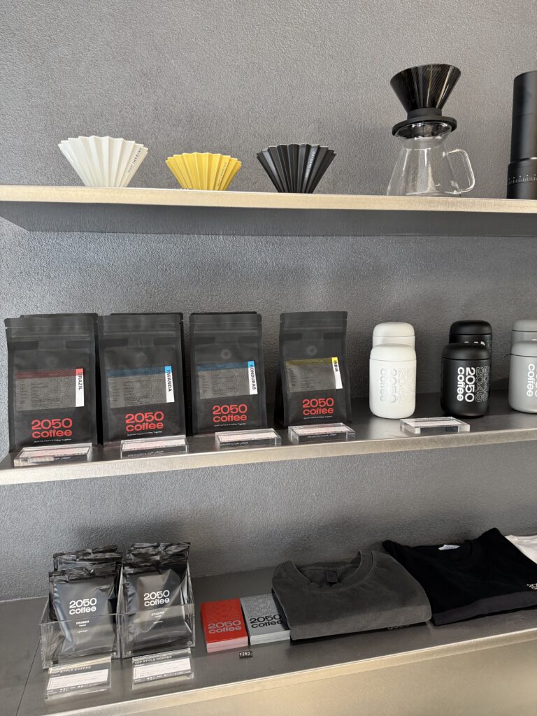 地球温暖化などの影響でコーヒー豆の主要品種アラビカ種の栽培適地が2050年までに半減する可能性が指摘される「コーヒー2050年問題」をバックグラウンドに誕生したため内観は2050年の近未来をイメージしたものになっていてハイセンスな空間。