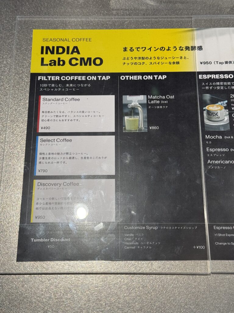 タップコーヒーはスタンダード、セレクト、ディスカバリーコーヒーとなっていてその他にはオーツ抹茶ラテがありました。