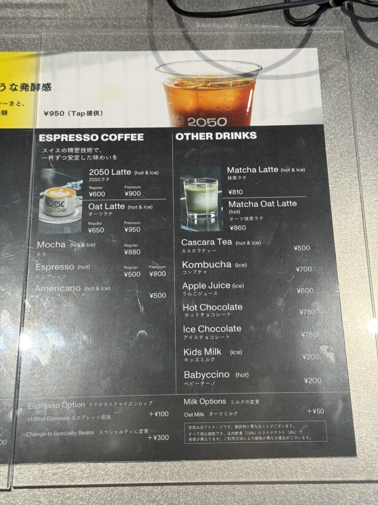 エスプレッソはカフェラテ、オーツラテ、アメリカーノなど。