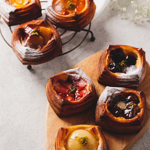 白桃やアプリコット、ダークチェリーを使ったカラフルなデニッシュも。