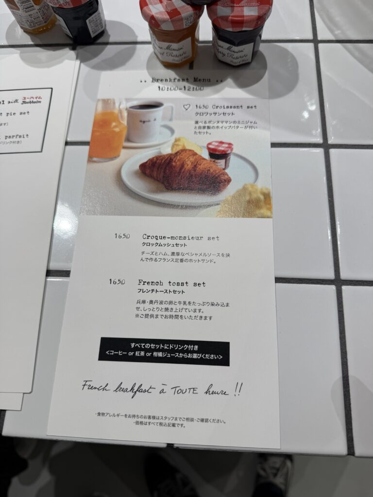 その他にも単品でフードはクロワッサン、パンオショコラなど、スイーツはガトーショコラやチーズケーキなどがありました。