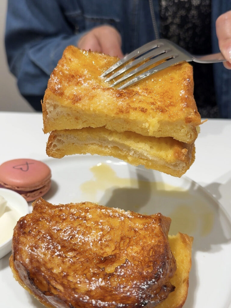 「リベルテ・パティスリー・ブーランジェリー」さんの食パンに兵庫・奥丹波の卵と牛乳をたっぷり染み込ませたアパレイユに蜂蜜をかけて、生クリームを添えたいモーニングセット。